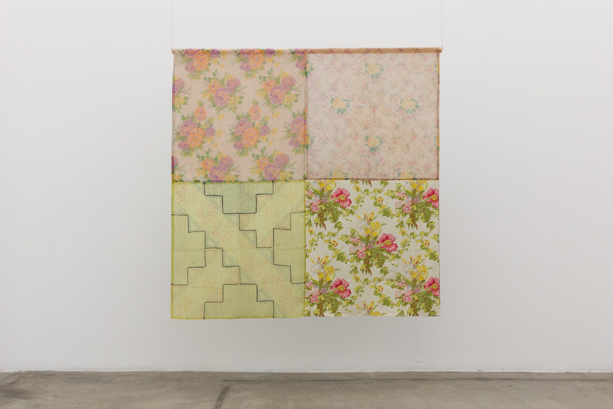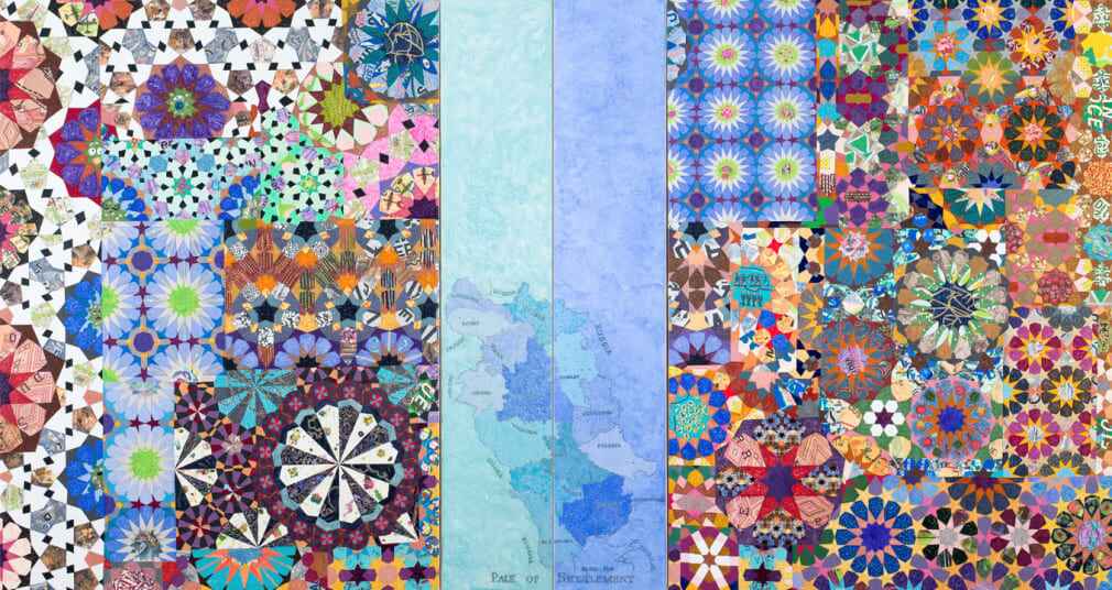 Can patterns be used as a voice without being decontextualized? Amir H. Fallah utilizes traditional patterns to explore complex themes of race and identity. In his paintings, patterns serve as silent markers of identity, replacing conventional forms of representation. In an interview, he stated that physical appearances reveal little about who someone is.57Scott, 2017. Challenging the traditional rules of portraiture—specifically, the depiction of facial features—he instead uses veils printed with intricate patterns as an alternative means of describing and representing individuals. The veils covering the figures, along with the interwoven rods and borders extending within and beyond the paintings, are directly inspired by Persian miniature painting, Persian carpets, and the ornamentation, patterns, and obsessive decoration found in Islamic art.58Scott, 2017. One of his exhibition, A War on Wars, stems from his childhood memories of war, having been born in Iran and later leaving the country following the Iran-Iraq War.59Galleryplatform LA, “AMIR H. FALLAH: A WAR ON WARS.” This project intertwines personal recollections with broader reflections on contemporary global conflicts.