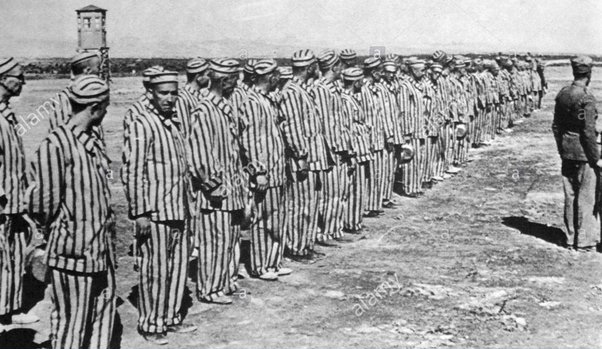 Fig 4. Prisoners in uniform, inside a Civil prison camp, in Republican Spain during the Spanish Civil War, Photo by Universal History Archive/Universal Images Group via Getty Images.